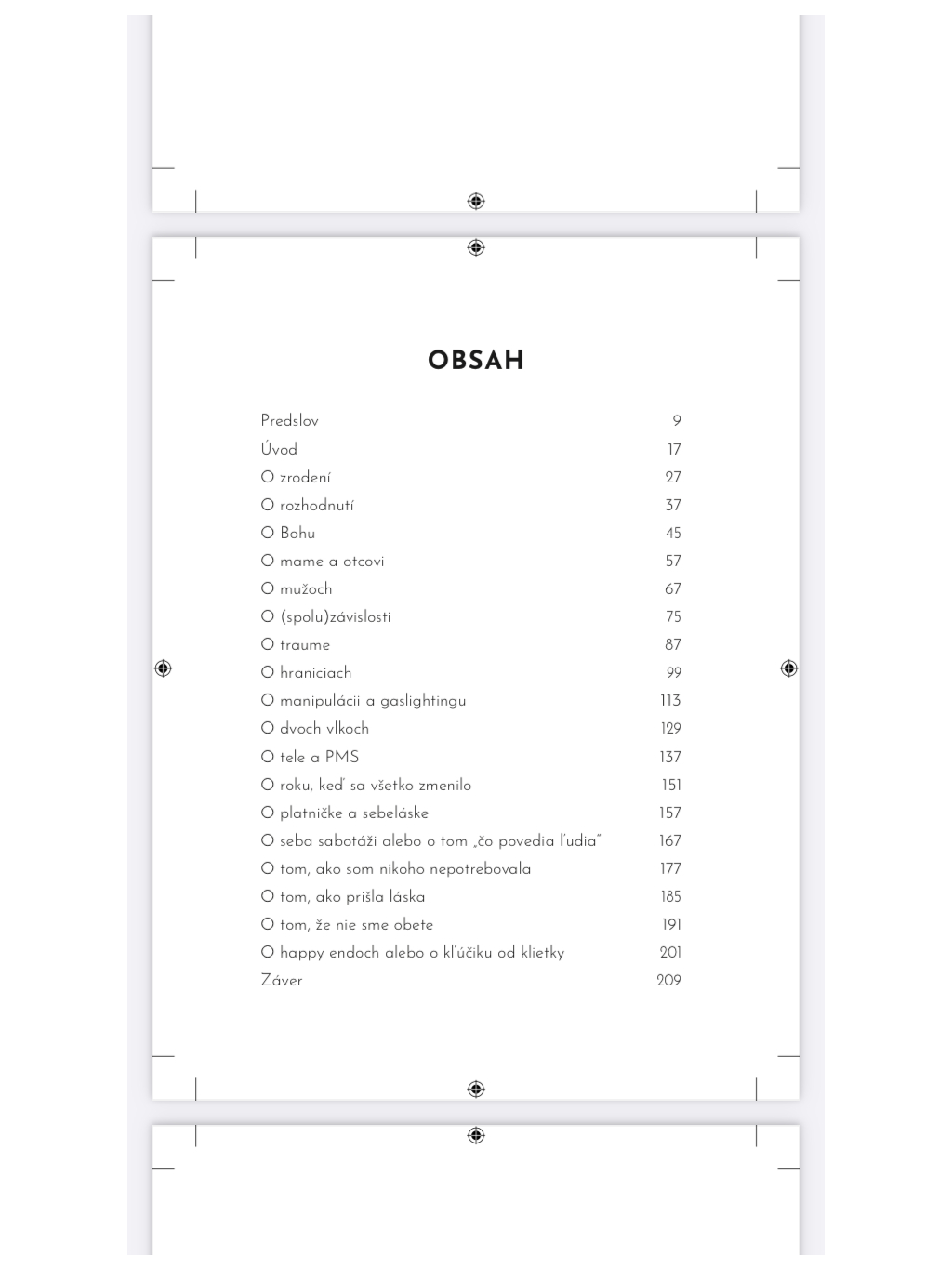 Nečakajte žiadnu motivačnú knihu o tom, ako nájsť šťastný život a nikdy o sebe nepochybovať. Neverím na happyendy ani na princov na bielom koni. No po rokoch zaoberania sa tým "čo povedia ľudia" som sa konečne rozhodla žiť taký život, od ktorého nemusím utekať. Išla som na terapiu, podala žiadosť o rozvod, vzdala sa úspešnej kaviarne nesúcej moje meno, presťahovala sa z dediny do mesta a začala som odznova. Pustila som všetky zdanlivé istoty, pretože som konečne, po rokoch, našla istotu v sebe.