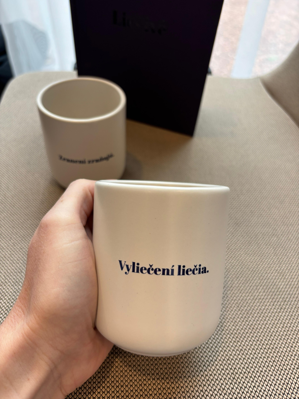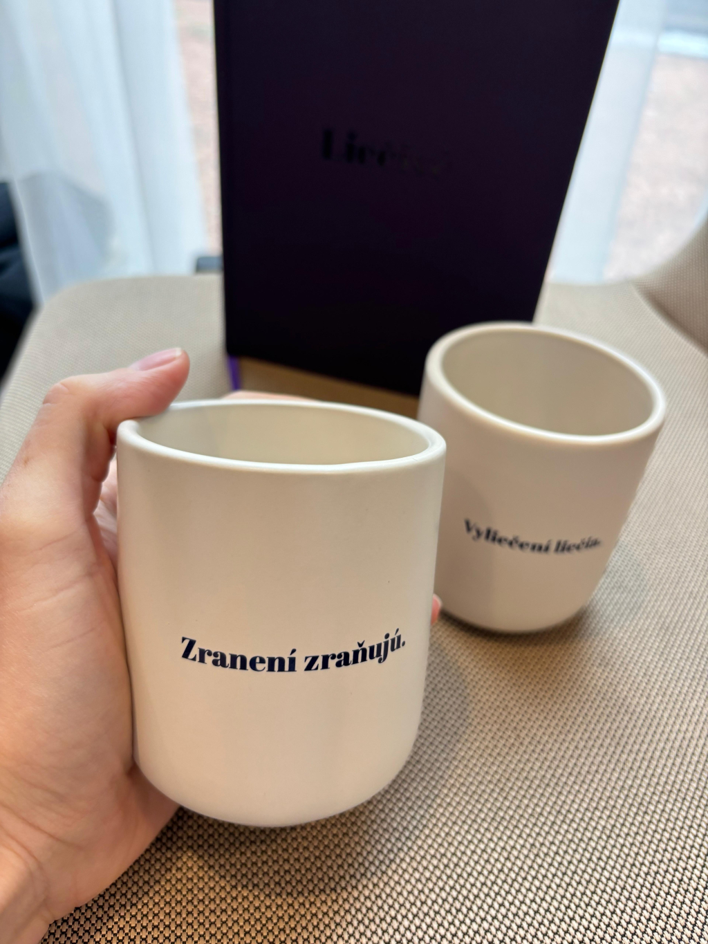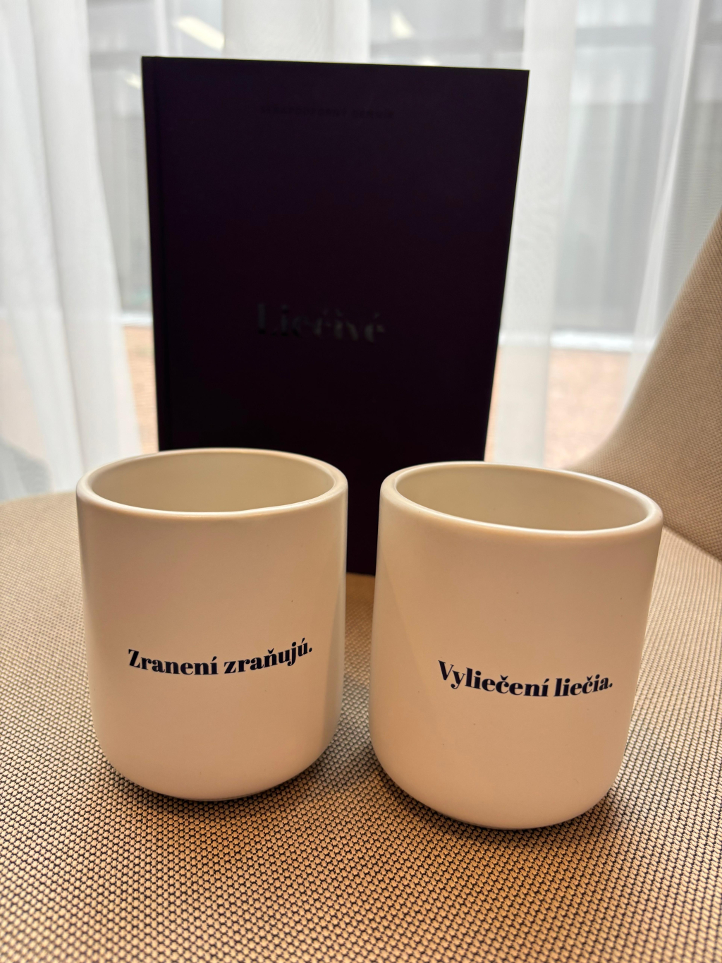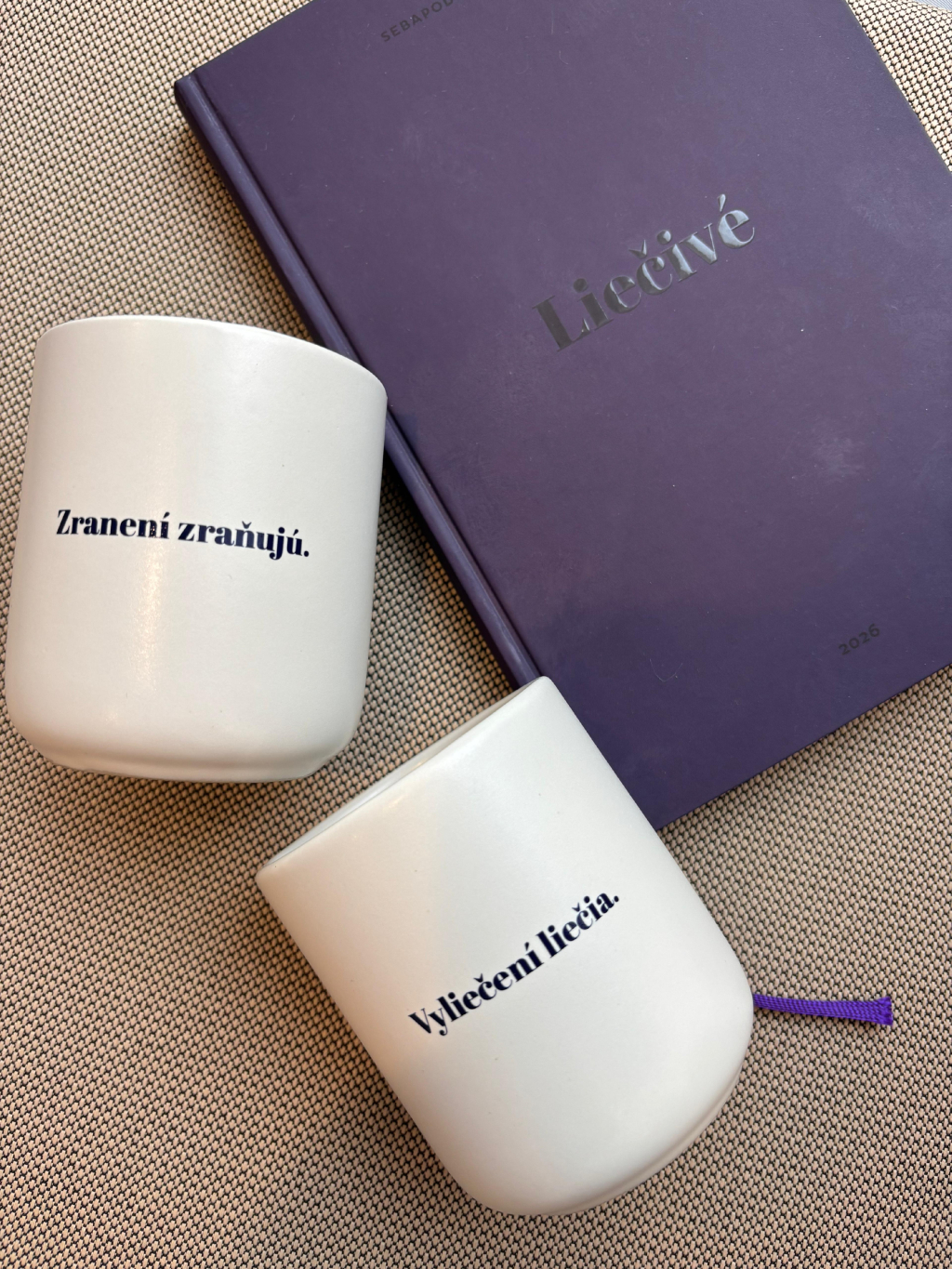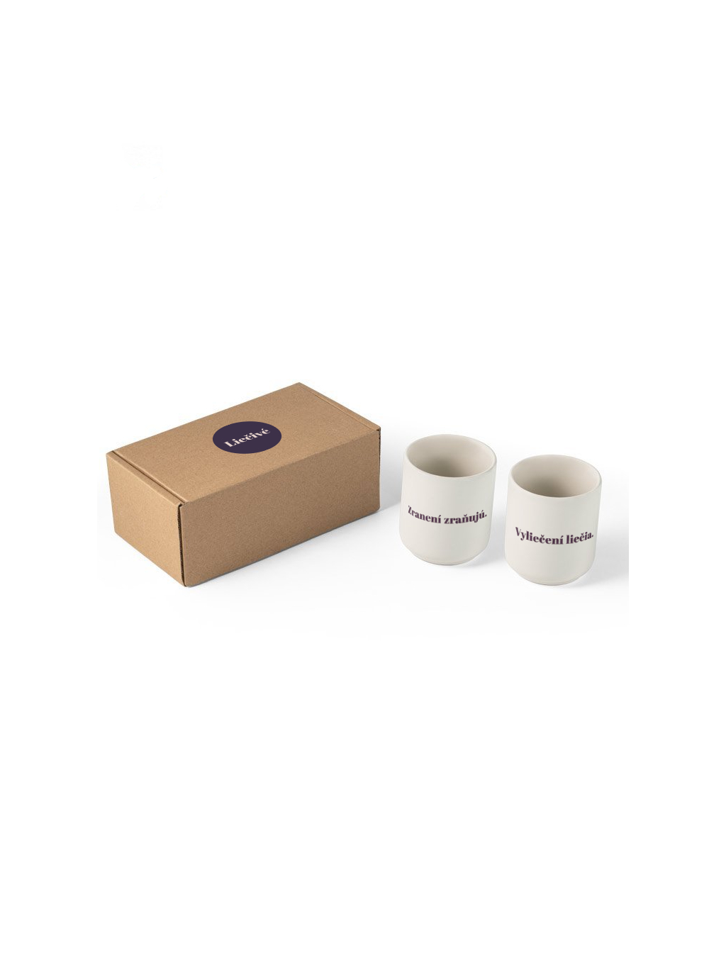 Súprava dvoch keramických pohárov s matným povrchom s nápisom “Zranení zraňujú” a na druhej šálke: “Vyliečení liečia.”